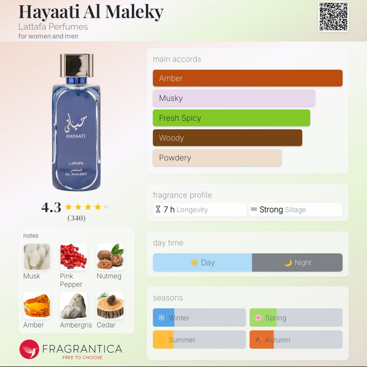 عطر ادکلن حیاتی الملکی (آبی)Hayaati Al Maleky از برند لطافه پرفیومزLattafa Perfumes، عطری شرقی و تند برای زنان و مردان است. این عطر جدید است.عطر ادکلن حیاتی الملکی (آبی) Hayaati Al Maleky در سال 2022 عرضه شد.