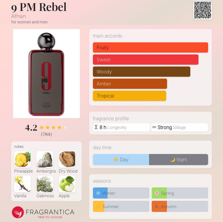 9PM Rebel از برند Afnan، عطری مناسب برای هر دو جنس است که ترکیبی پر جنب و جوش از نتهای میوهای و چوبی را ارائه میدهد. این ترکیب با رایحههای طراوتبخش نارنگی، آناناس و سیب گرنی اسمیت آغاز میشود و به رایحههای میانی چوب سدر، خزه بلوط و وانیل ختم میشود. نتهای پایه آن شامل کارامل، چوبهای خشک، عنبر سائل و مشک است که پایانی گرم و ماندگار را رقم میزند.