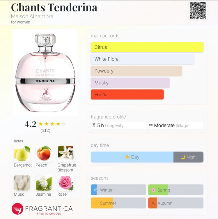 عطر ادکلن Chants Tenderina از برند میسون الحمبرا Maison Alhambra عطری زنانه با رایحه گلی-میوه ای است. Chants Tenderina در سال 2022 به بازار عرضه شد.