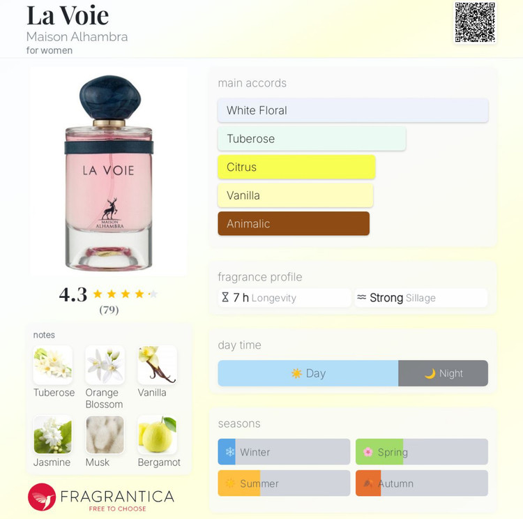عطر ادکلن La Voie از برند میسون الحمبرا Maison Alhambra عطری زنانه با رایحه گل است. La Voie در سال 2022 به بازار عرضه شد.