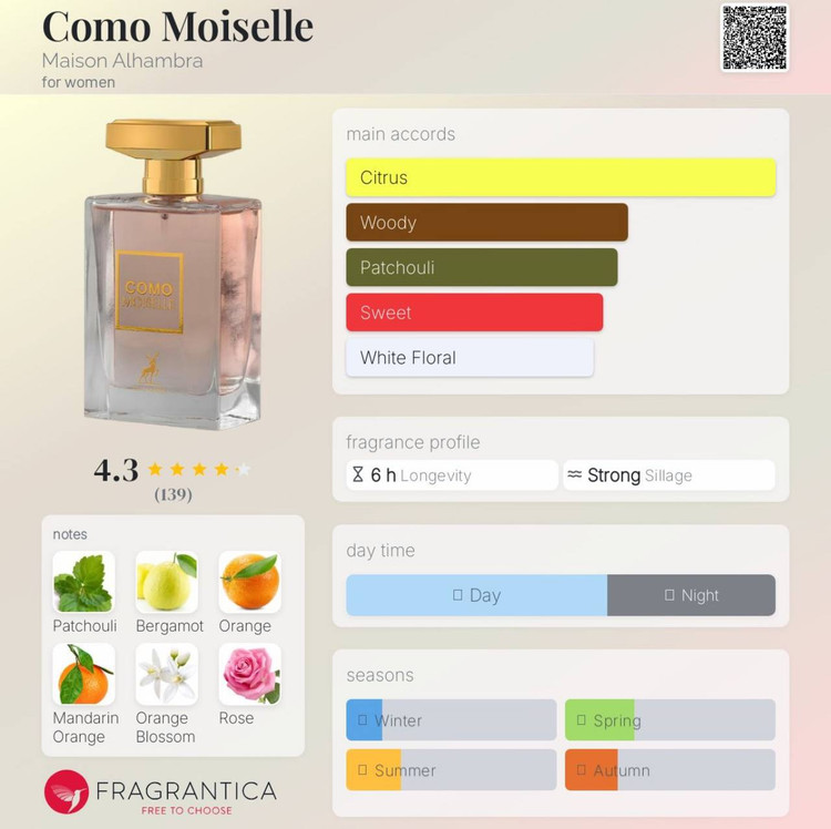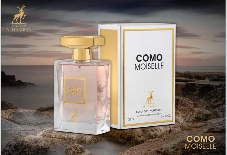 Como Moiselle by Maison Alhambra یک عطر گل شرقی برای زنان است. Como Moiselle در سال 2022 راه اندازی شد. نت های برتر عبارتند از ترنج، پرتقال، ماندارین و شکوفه پرتقال. نت های میانی عبارتند از رز ترکی، یاس، میموزا و یلانگ یلانگ. نت های پایه عبارتند از: پاتچولی، وتیور، وانیل، دانه تونکا، مشک سفید و اوپوناکس.