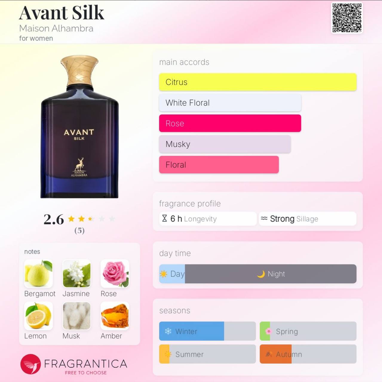 عطر ادکلن آوانت سیلک Avant Silk یک عطر مشک چوبی گلدار برای زنان است. این یک عطر جدید است. Avant Silk در سال 2025 راه اندازی شد. نت های برتر ترنج و لیمو هستند. نت های میانی یاس و گل رز هستند. نت های پایه مشک، کهربا و نعناع هندی هستند.