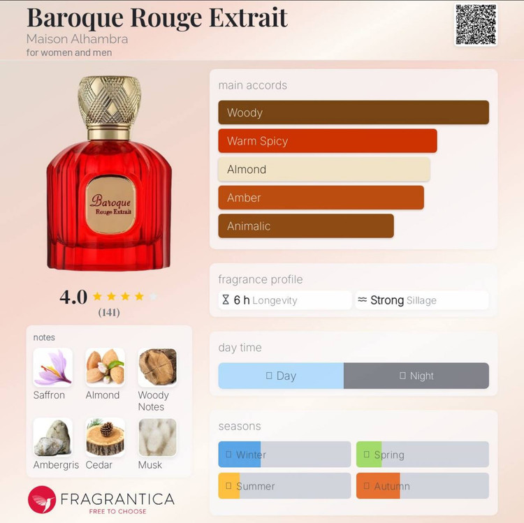 Baroque Rouge Extrait اثر Maison Alhambra یک عطر تند معطر برای زنان و مردان است. Baroque Rouge Extrait در سال 2022 راه اندازی شد. نت های برتر زعفران و بادام هستند. نت های میانی نت های چوبی، سرو و یاس مصری هستند. نت های پایه نت های چوبی، عنبر و مشک هستند.
