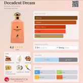 Decadent Dream اثر Maison Alhambra یک عطر گل شرقی برای زنان و مردان است. این یک عطر جدید است. Decadent Dream در سال 2025 راه اندازی شد. نت های برتر فندق، گلابی و اولیبانوم هستند. نت های میانی عبارتند از: اسمانتوس، زعفران، رز و یاسمن سامباک. نت های پایه عبارتند از چوب صندل، لبدانوم، وانیل و عنبر. Decadent Dream یک عطر لوکس یونیسکس است که با ترکیبی جذاب از گلابی آبدار، فندق غنی و اولیبانوم رزینی شروع می شود و یک مقدمه شیرین و کمی دودی ایجاد می کند. The Heart یک ترکیب گل مجلل با اسمانتوس، رز، زعفران و یاسمن سامباک را نشان می دهد که ظرافت عجیب و غریبی را با کمی ادویه ارائه می دهد. این عطر در پایهای منحط از چوب صندل و وانیل خامهای قرار میگیرد که با گرمای پیچیده عنبر و لبدانوم متعادل میشود و ظاهری صاف و دلپذیر به جا میگذارد که غنای لذیذ را با ظرافت گل و گرمای عمیق چوبی ترکیب میکند.
