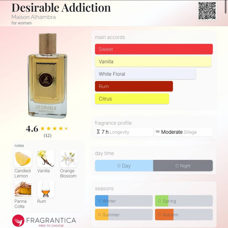 عطر ادکلن دزیرابل ادکشن Desirable Addiction (اعتیاد مطلوب) توسط Maison Alhambra یک عطر لذیذ مرکبات برای زنان است. این یک عطر جدید است. عطر ادکلن دزیرابل ادکشن Desirable Addiction (اعتیاد مطلوب) در سال 2025 راه اندازی شد. نت های میانی شکوفه پرتقال، پاناکوتا و رام هستند. نت پایه وانیل است